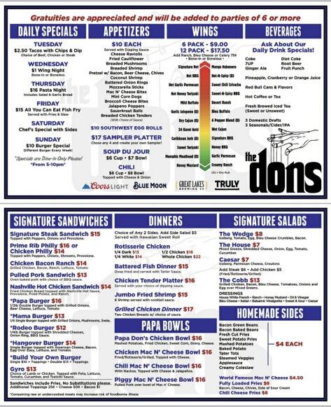 Welcome to Papa Don's Pub, your friendly neighborhood spot in Akron, Ohio! For over 10 years, we've been dedicated to serving delicious home-style meals crafted with fresh local ingredients. Join us for our nightly dinner specials and take advantage of our unbeatable Happy Hour from 4-9 PM. With the largest heated patio in town, along with a variety of games and over 10 big-screen TVs, there's something for everyone. Whether you're dining solo or with friends, experience family, fun, and fantastic food at Papa Don's. Visit us today at 1891 E Market St!